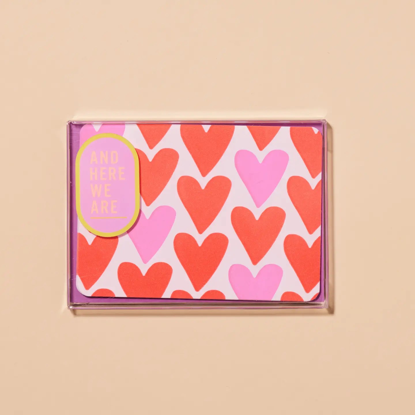 Letterpress printed. Heart pattern in neon red and barbie pink. Purple envelopes